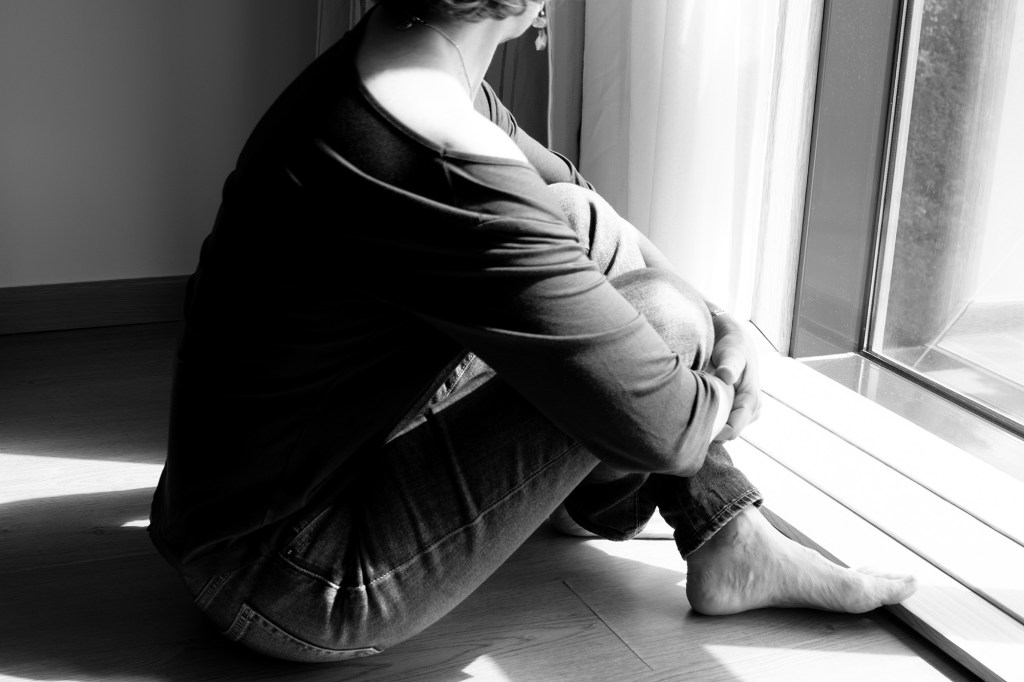 queixo nas mãos.