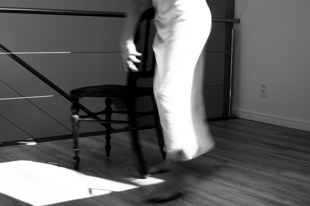 She walks in my direction, but does not see me; she agitates her hand, moves her fingers as if trying to grab the air. In spite of her peculiar behaviour, her expression is pacific, her posture is calm.